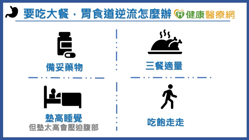過年大吃大喝,胃食道逆流可以預防嗎?胃食道逆流容易使人腸胃不舒服,發生在佳節期間非常掃興,美國胃腸病協會(American Gastroenterological Association)病人衛教顧問醫師Rajeev Jain表示,除了美食適可而止等,他也會隨身攜帶相關藥物,覺得「有危險」警訊,可事先服用,減緩不適症狀。