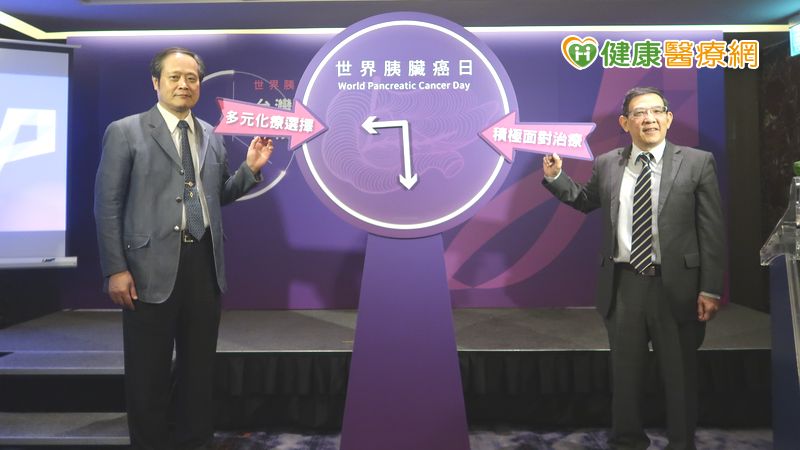 中華民國癌症醫學會理事長陳立宗(左)與台灣胰臟醫學會理事長葉大森(右)在世界胰臟癌日鼓勵患者積極治療。